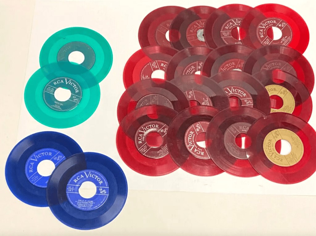 A chegada do formato do single a 45 rotações, no final da década de 40 levou a RCA Victor a apostar na cor como forma de distinguir o estilo musical dos seus lançamentos. Havia então várias séries, todas com cores diferentes, cabendo o vermelho à música clássica ou o verde ao country & western, o azul escuro aos clássicos populares e canções vindas dos musicais, o amarelo à música infantil, o tom de cereja cabia ao gospel e ao rhythm’n’blues, o azul claro aos lançamentos internacionais. O vinil negro cabia aqui à música pop. Esta ideia revelou-se economicamente inviável e, chegados aos anos 50, os singles da RCA eram já todos prensados em vinil negro.