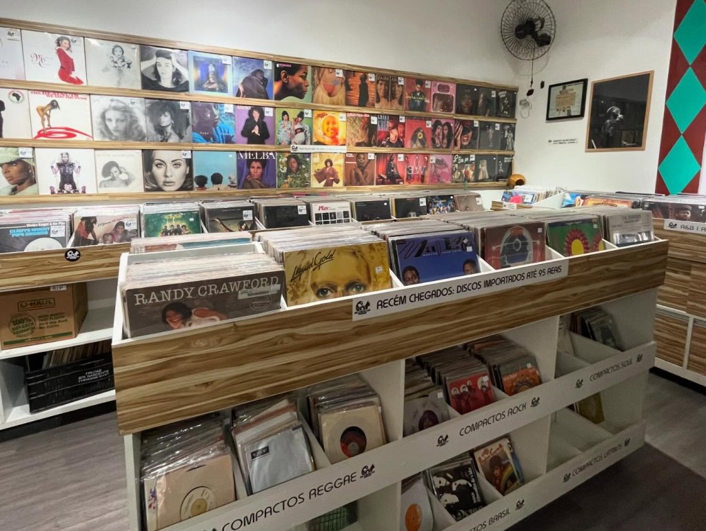 Continuando a caminhar entre as lojas que encontramos no piso superior da Galeria Nova Barão, no centro de São Paulo, entramos desta vez na Petróleo Music, loja de desde logo chama a atenção no exterior pela decoração com plantas que adorna a entrada. Esta ideia de pensar a cenografia não se esgota aqui já que a parede maior que encontramos no lado esquerdo da loja costuma apresentar coleções de capas que podem ou contar histórias, sugerir gradações de cor, desenhar ambientes…