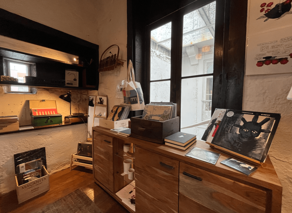 Quem entrar na livraria notará, logo na primeira sala do piso térreo, a presença de um armário com uma seleção de CD. Porém vale a pena subir as escadas e descobrir as suas salas que encontramos no piso superior entre as quais há livros dedicados à música, ao cinema e às artes do palco e também uma seleção de títulos em vinil. Os discos que aqui encontramos são todos eles títulos novos, em primeira mão, revelando ora novos lançamentos ora reedições, com uma curadoria que naturalmente não esquece a presença de Braga e também do próprio Theatro Circo (ali perto) entre a oferta ali presente.